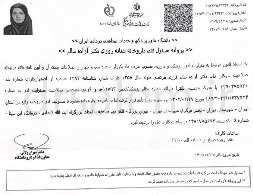 پروانه و مجوزهای داروخانهداروخانه دکتر سالم1404-08-18T12:06:45+03:30 پروانه و مجوزهای داروخانه دکتر آزاده سالم پروانه کسب مجوز رسمی فروش محصولات غیر دارویی پروانه تاسیس داروخانه پروانه مسئول فنی خدمات ماپشتیباتی 7/24 پشتیبانی آنلاین ۷ روز هفته ۲۴ ساعت شبانه روز ارسال و تحویل رایگان برای خریدهای بیش از 1 میلیون تومان تضمین اصالت کالا تضمین اصالت کالای خریداری شده